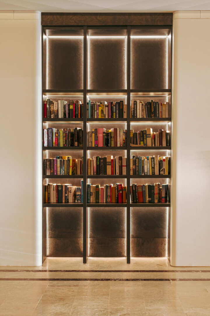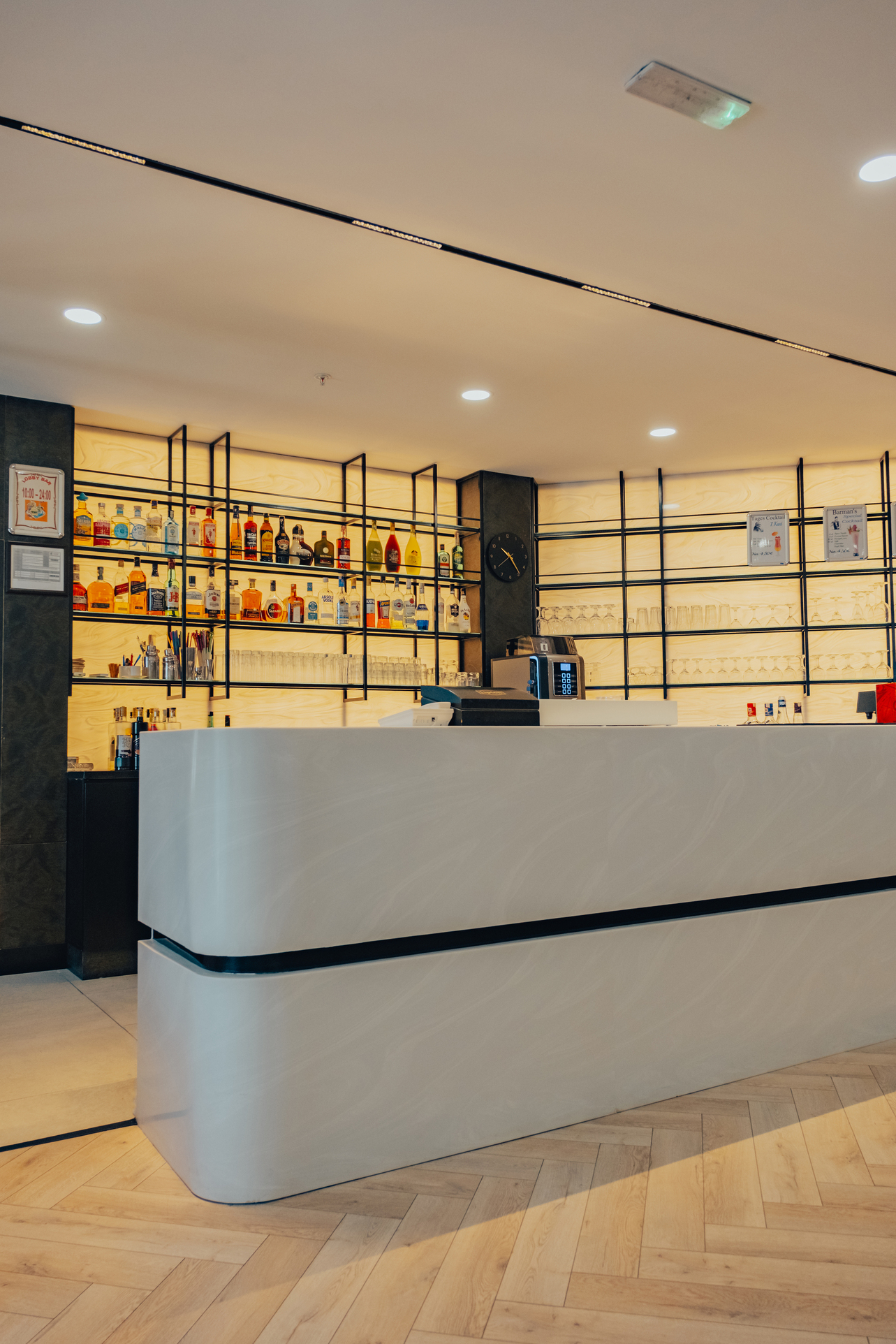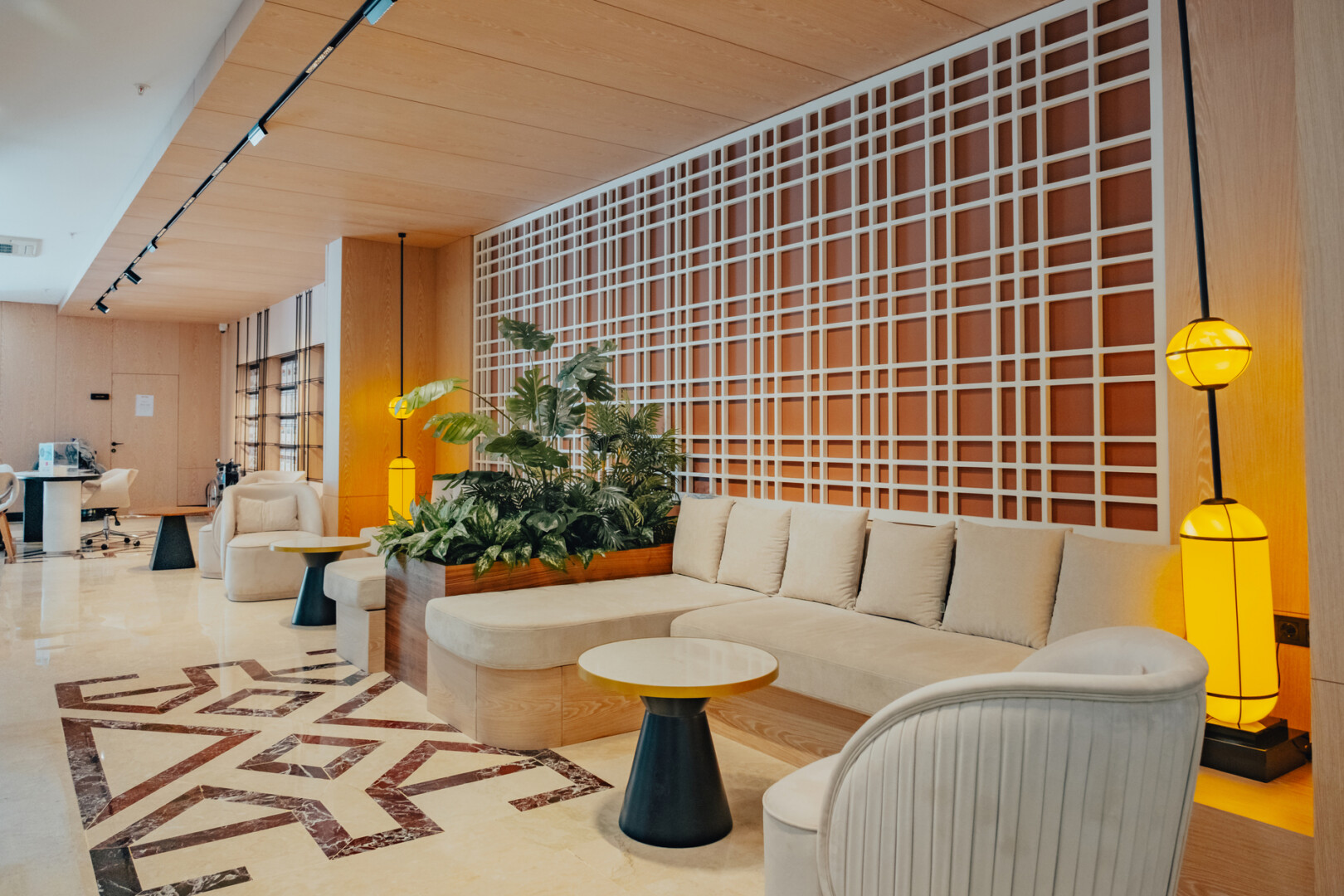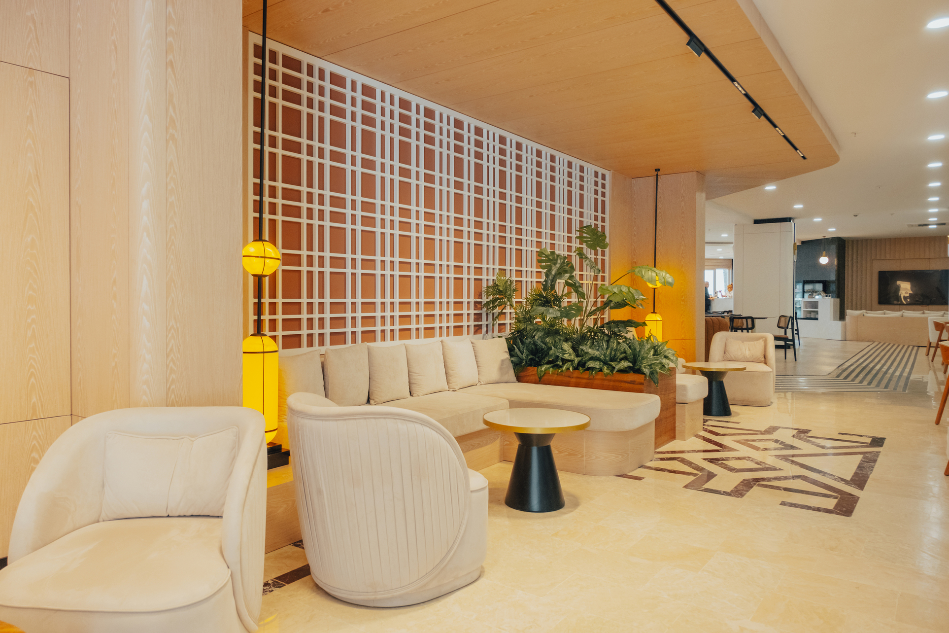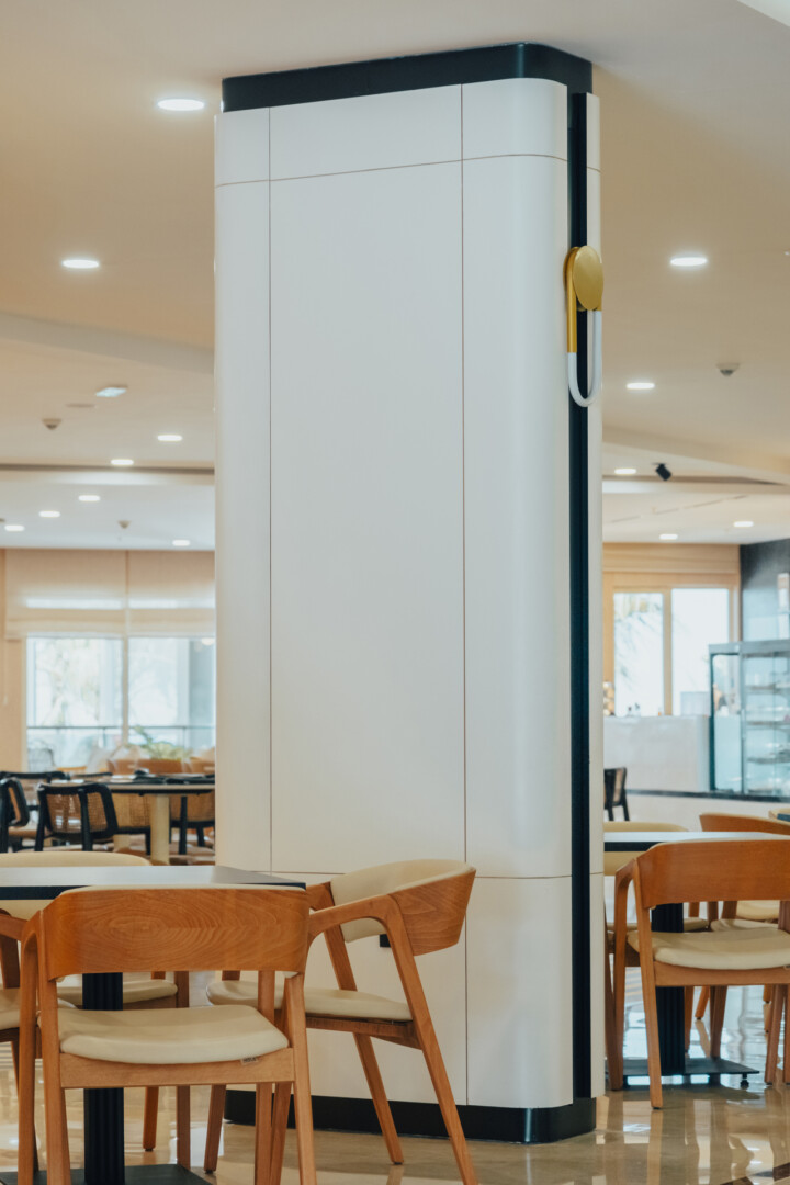 Mobilya uygulamalarında ise otelin yoğun kullanımına uygun, konforlu ve uzun ömürlü çözümler ürettik. Lobby bar alanında hem gündüz hem akşam saatlerinde farklı kullanımlara olanak sağlayacak esnek bir düzen kurguladık. Danışma bölümünde ise misafirlerin kolay yönlendirme alabilecekleri, aynı zamanda davetkâr bir karşılamayla buluşabilecekleri bir atmosfer oluşturduk. Aydınlatma detaylarını, mekânın hem fonksiyonel hem de estetik ihtiyaçlarına cevap verecek şekilde tasarladık.
