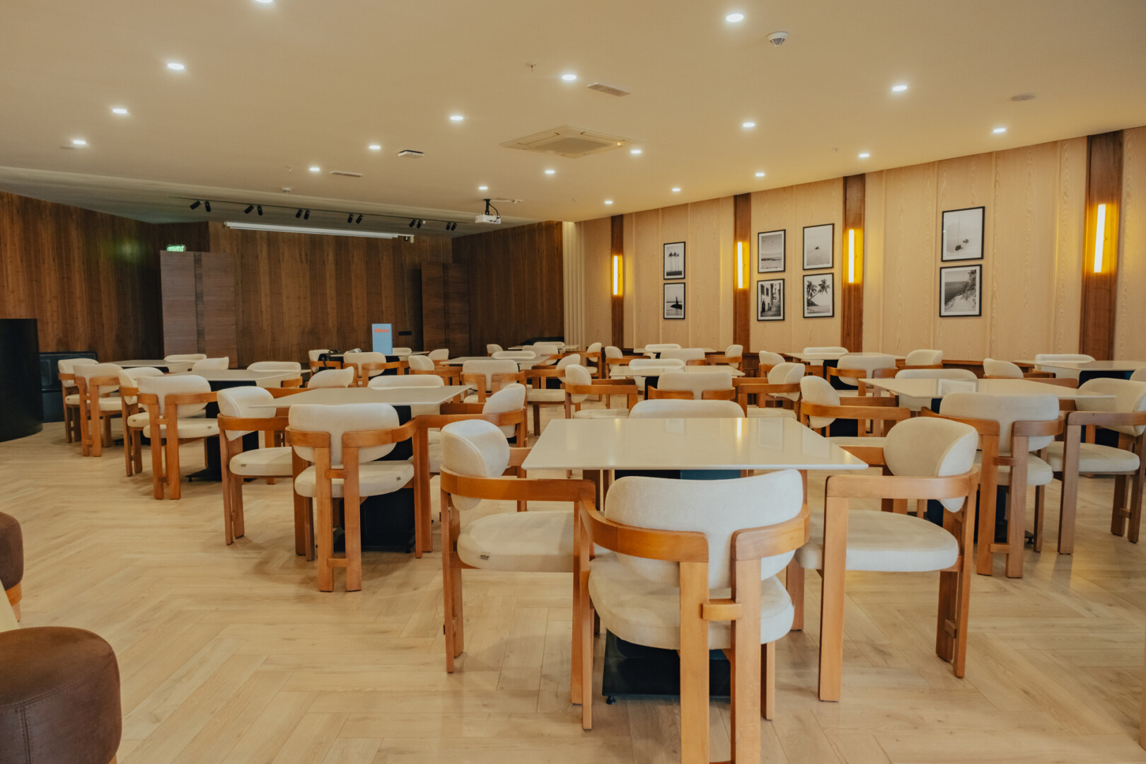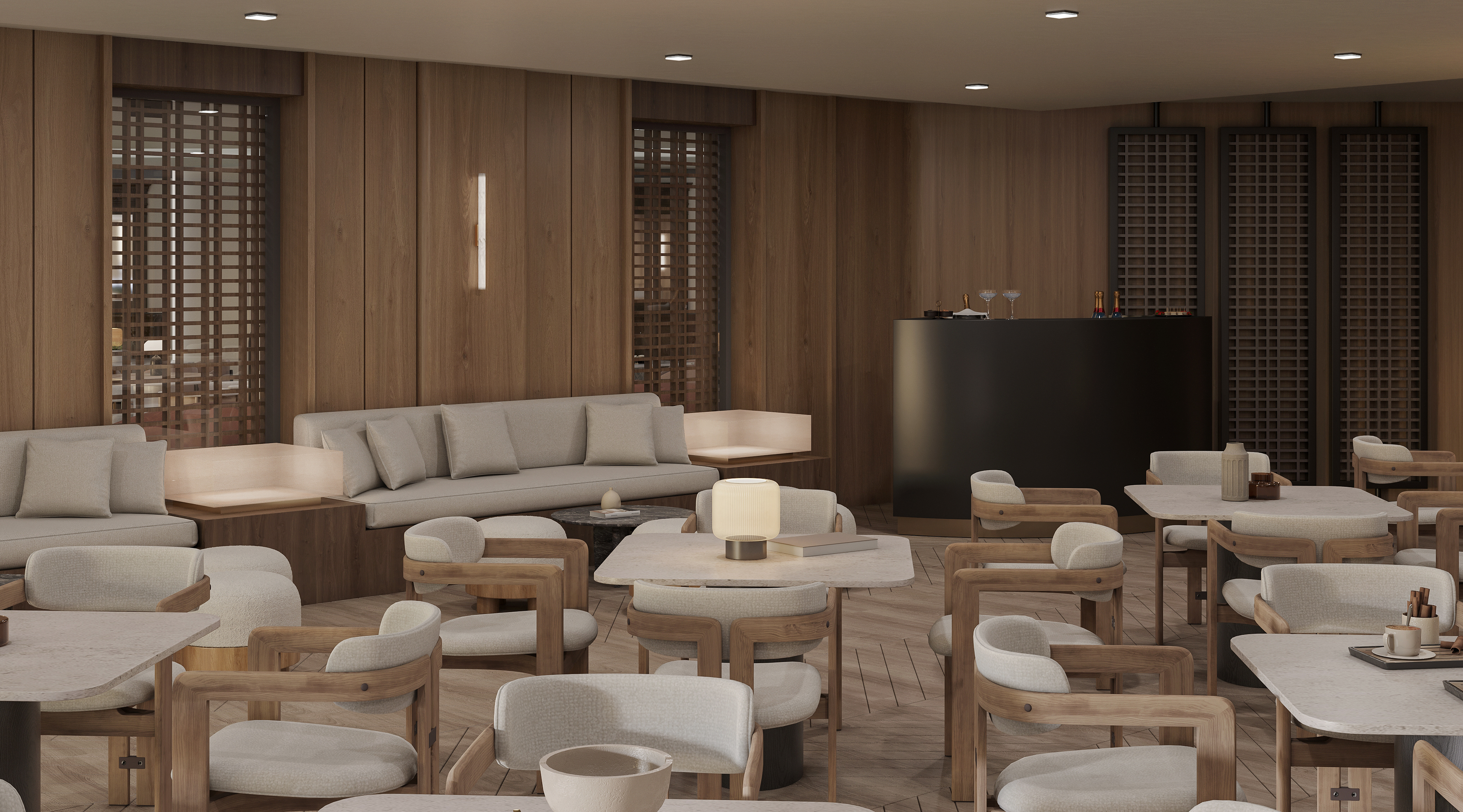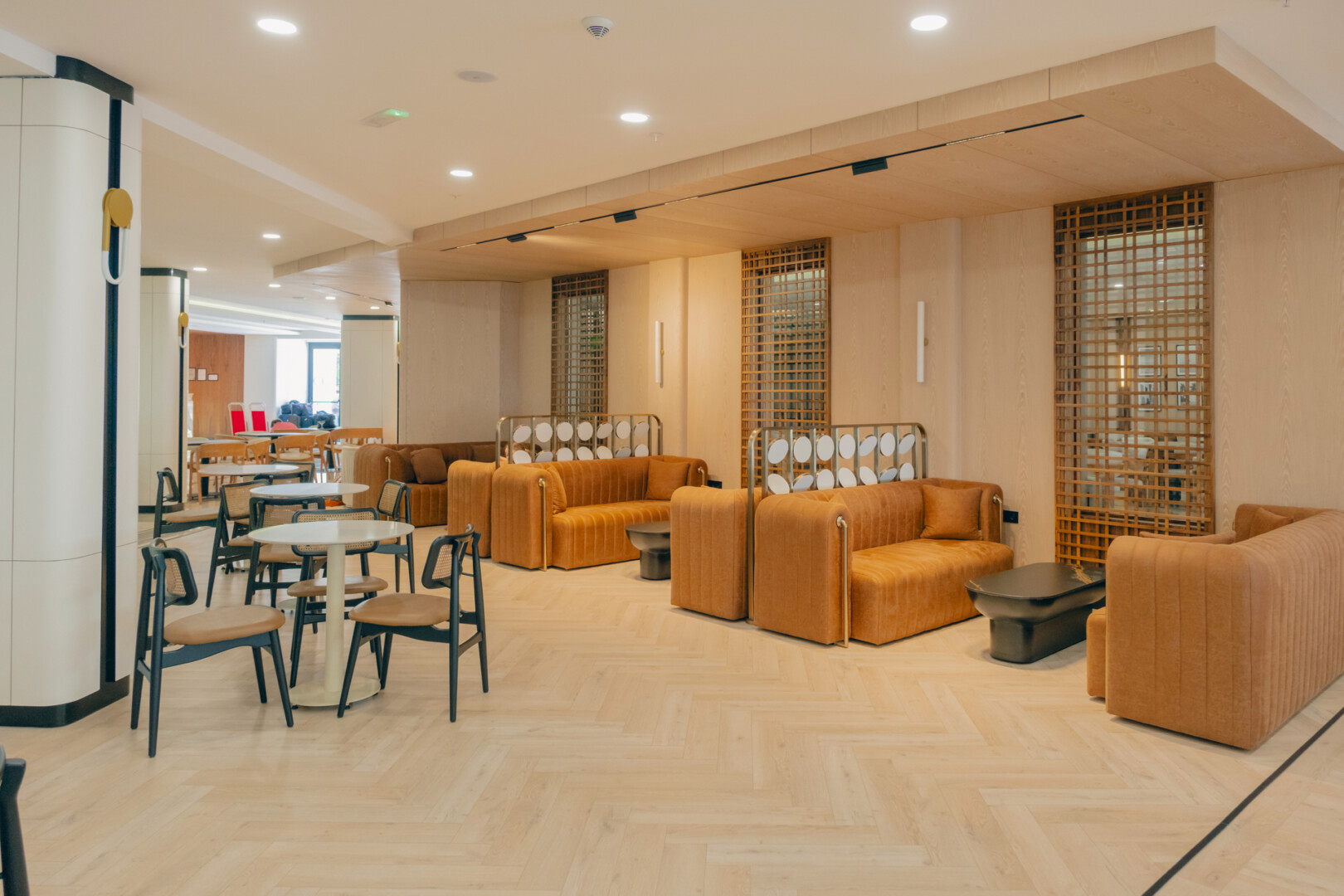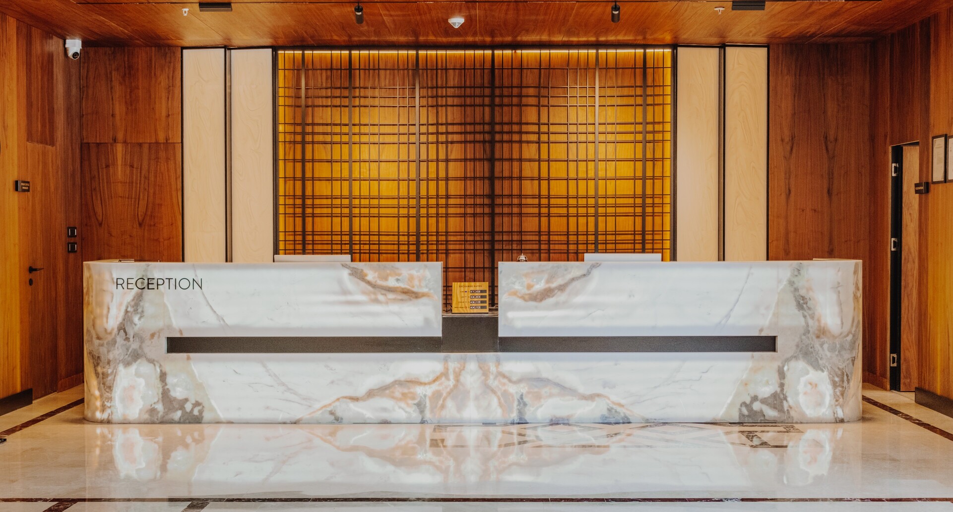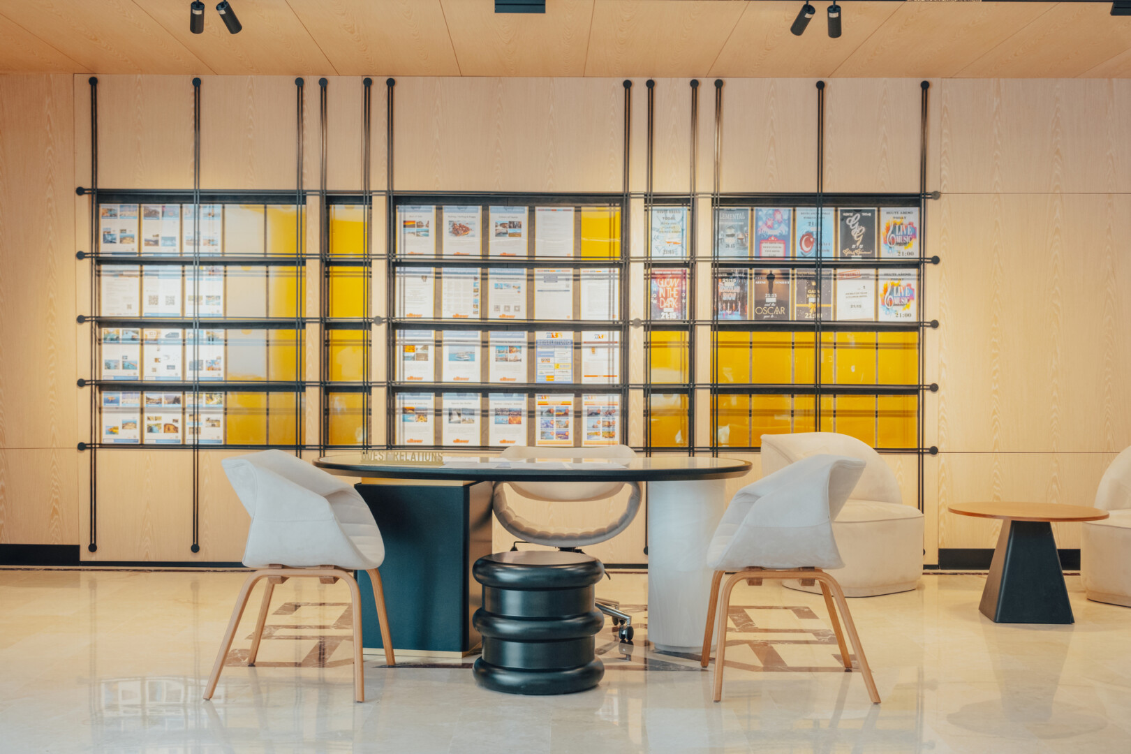 Mobilya uygulamalarında ise otelin yoğun kullanımına uygun, konforlu ve uzun ömürlü çözümler ürettik. Lobby bar alanında hem gündüz hem akşam saatlerinde farklı kullanımlara olanak sağlayacak esnek bir düzen kurguladık. Danışma bölümünde ise misafirlerin kolay yönlendirme alabilecekleri, aynı zamanda davetkâr bir karşılamayla buluşabilecekleri bir atmosfer oluşturduk. Aydınlatma detaylarını, mekânın hem fonksiyonel hem de estetik ihtiyaçlarına cevap verecek şekilde tasarladık.