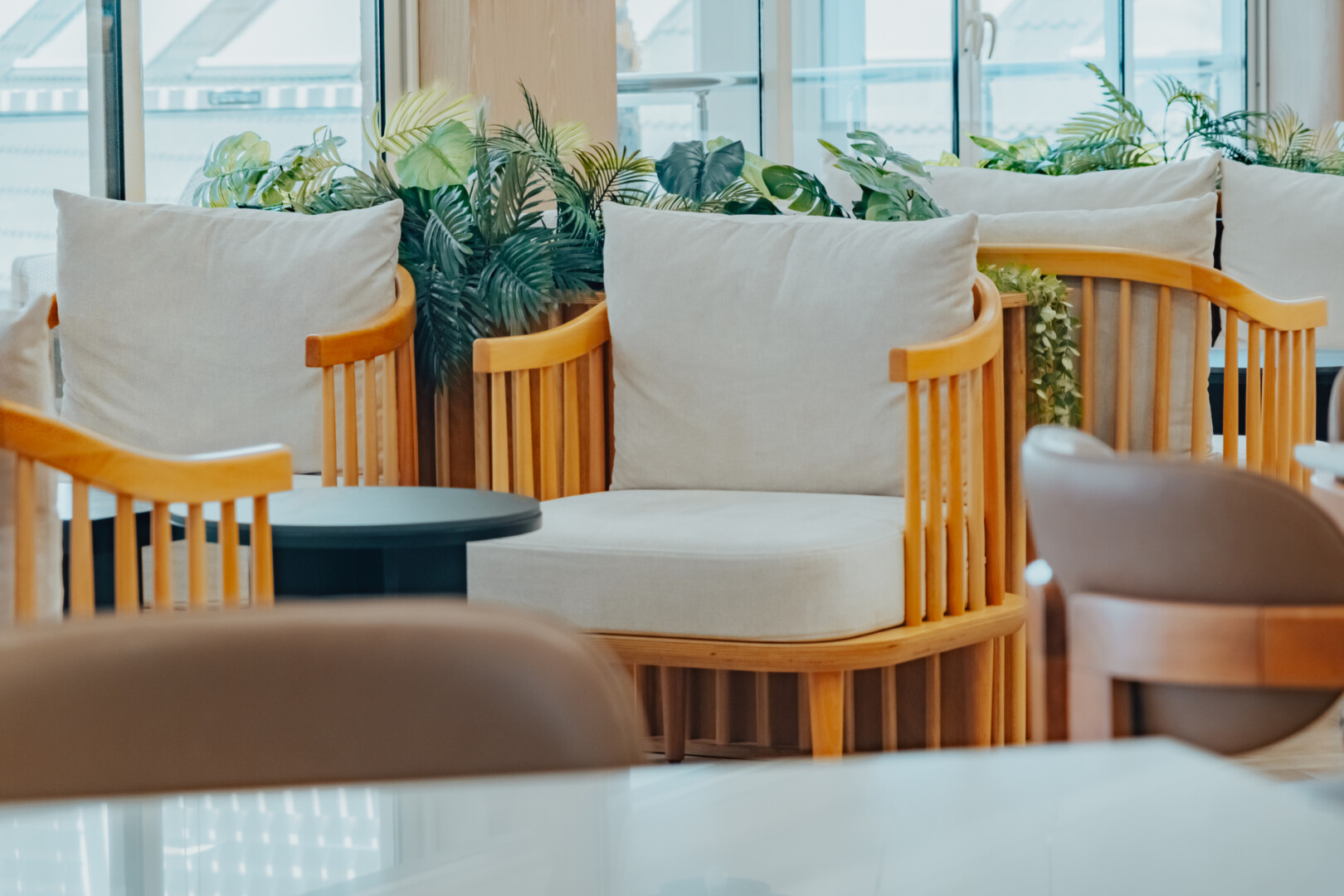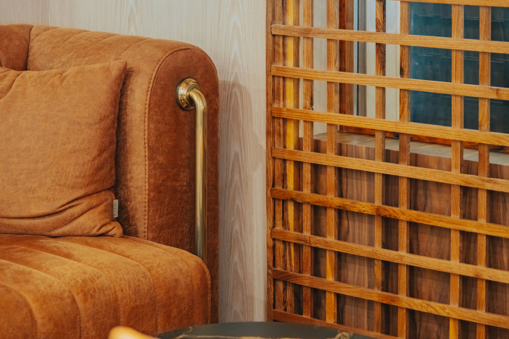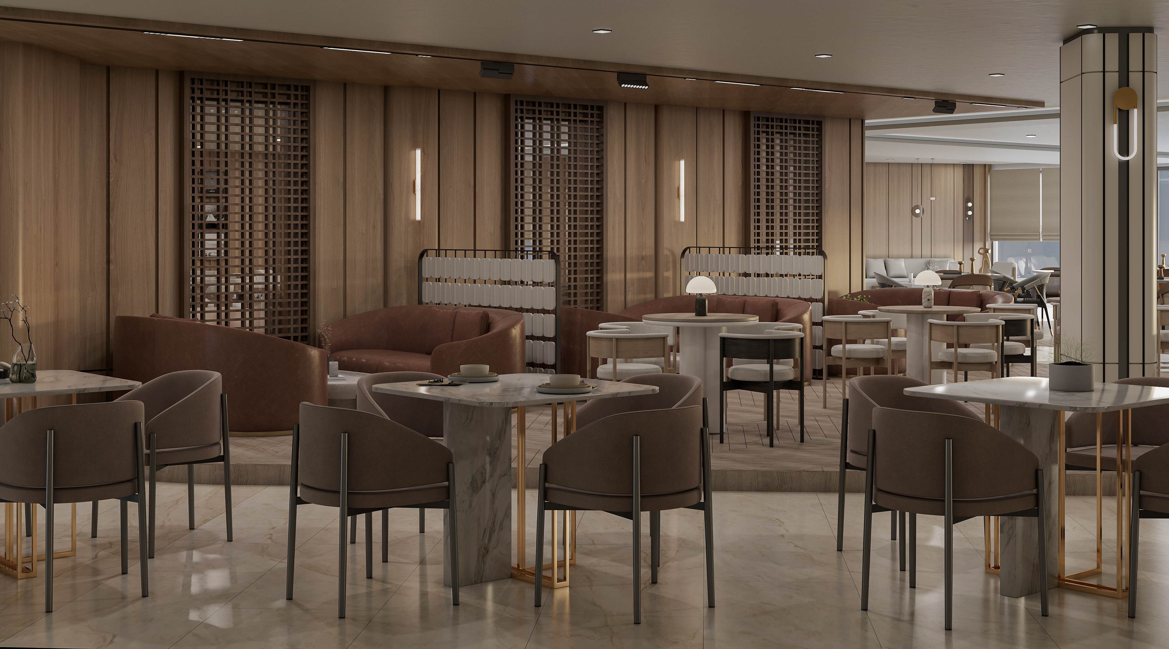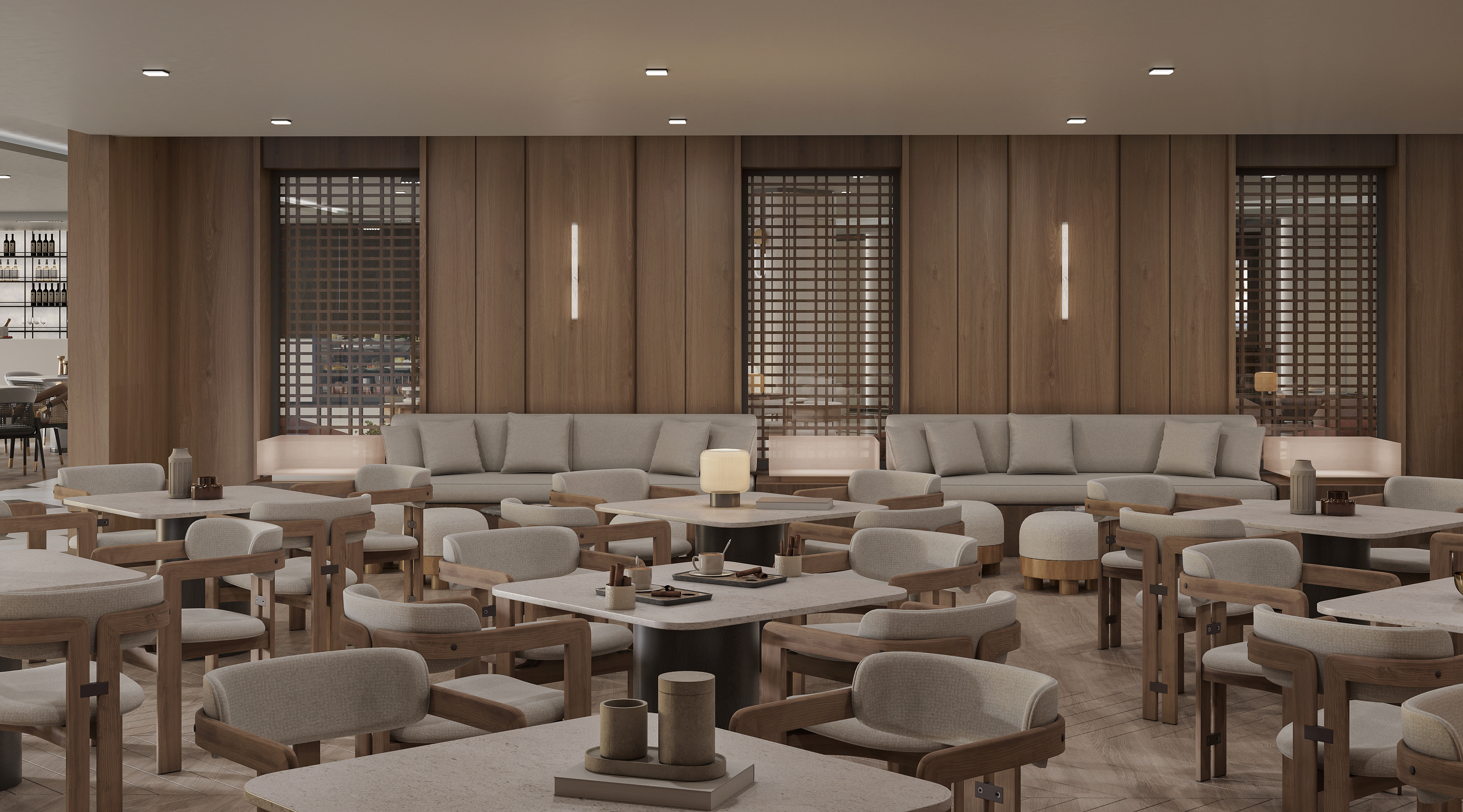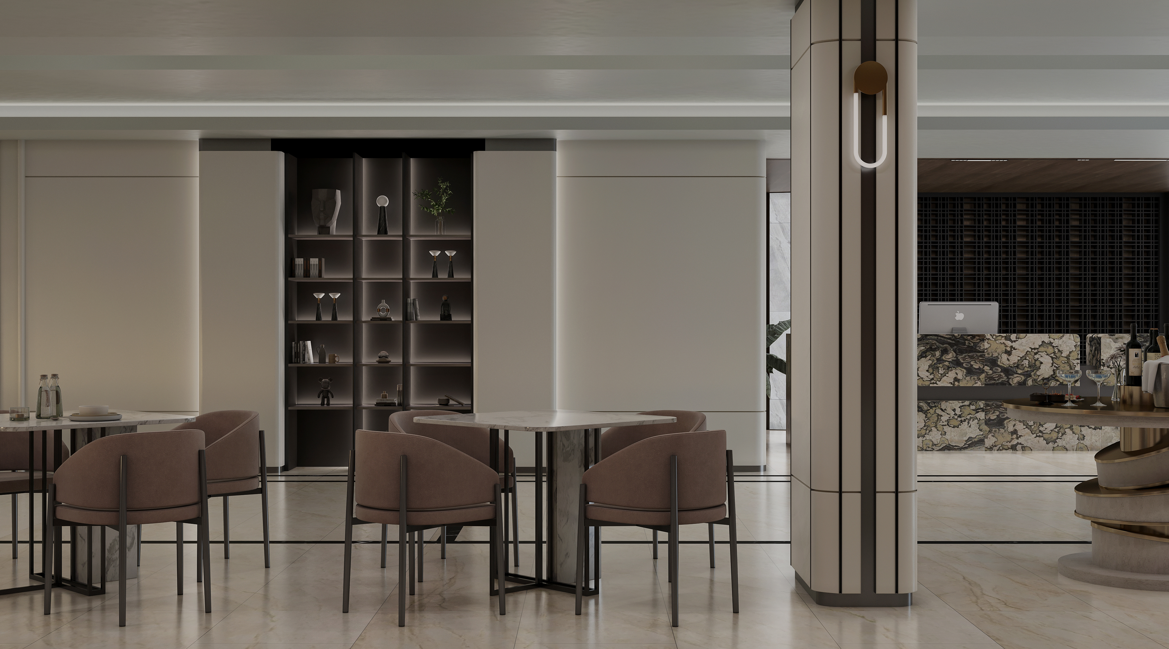 Mobilya uygulamalarında ise otelin yoğun kullanımına uygun, konforlu ve uzun ömürlü çözümler ürettik. Lobby bar alanında hem gündüz hem akşam saatlerinde farklı kullanımlara olanak sağlayacak esnek bir düzen kurguladık. Danışma bölümünde ise misafirlerin kolay yönlendirme alabilecekleri, aynı zamanda davetkâr bir karşılamayla buluşabilecekleri bir atmosfer oluşturduk. Aydınlatma detaylarını, mekânın hem fonksiyonel hem de estetik ihtiyaçlarına cevap verecek şekilde tasarladık.